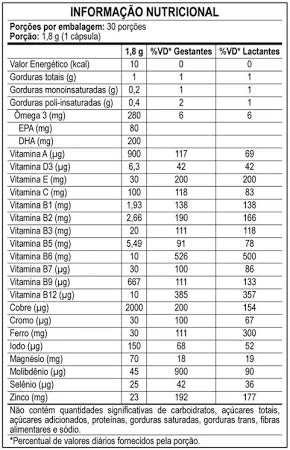 Sua fórmula contém óleo de peixe rico em DHA (ácido docosa-hexaenoico), um tipo de ômega-3 fundamental para o desenvolvimento cerebral e visual do bebê, além de 20 vitaminas e minerais que auxiliam na formação do sistema imunológico, ossos e tecidos durante a gestação e amamentação.