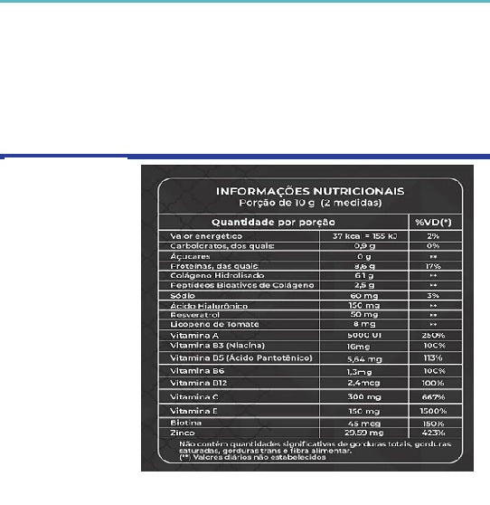 INGREDIENTES: Colágeno Hidrolisado, Peptídeos Bioativos de Colágeno Hidrolisado, Ácido Ascórbico (vitamina C), Dl alfa acetato de tocoferol (vitamina E), Hialuronato de Sódio obtido pela fermentação de Streptococcus zoepedemicus (fonte de Ácido Hialurônico), Niacina (Vitamina B3), Resveratrol (fonte de Resveratrol), Sulfato de Zinco (Zinco), Licopeno de Tomate (Licopeno), Pantotenato de Cálcio (Vitamina B5), Cloridrato de Piridoxina (Vitamina B6) Palmitato de Retinol (Vitamina A), Cianocabalamina (Vitamina B12), Biotina, aroma natural, acidulante ácido cítrico e edulcorante sucralose. NÃO CONTÉM GLÚTEN.