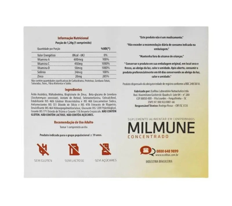 Milmune Suplemento Alimentar Concentrado 30cps - Ecofitus Sabor Sem Sabor
